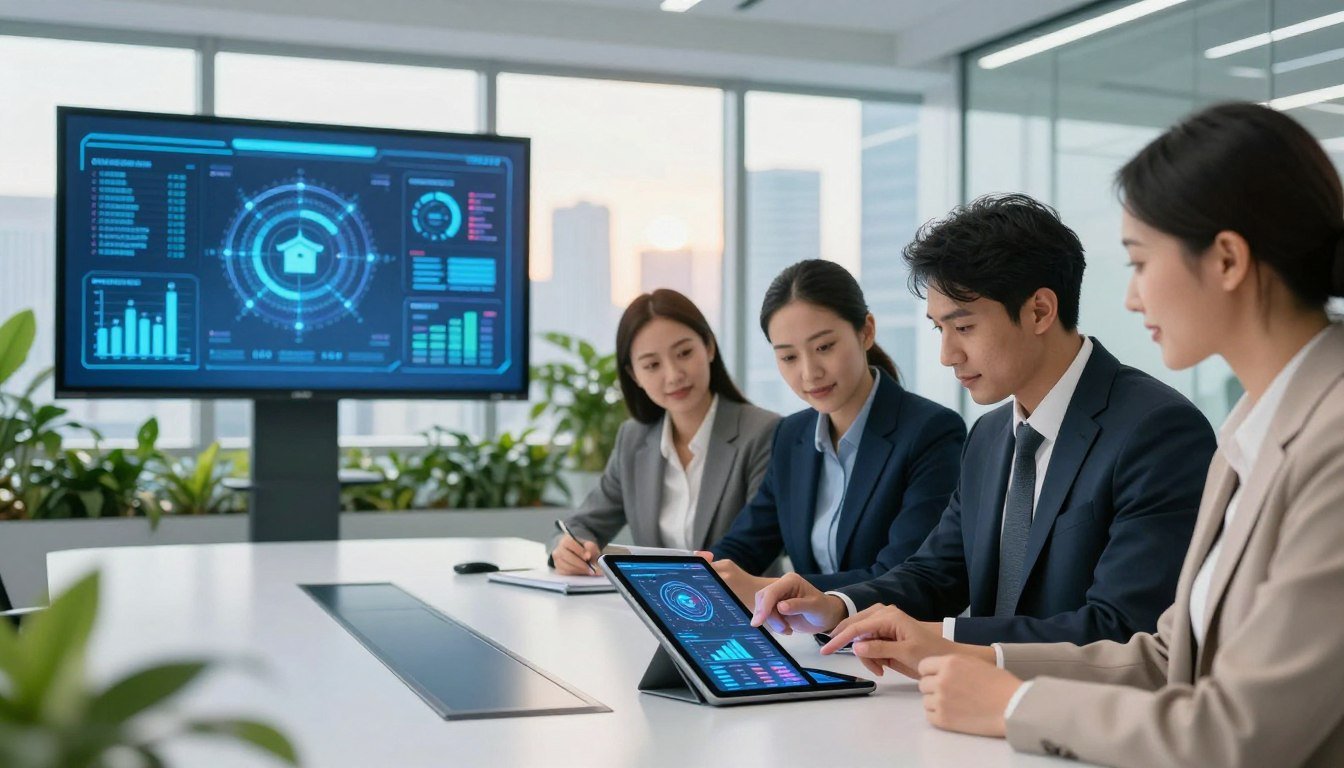 A modern office setting showcasing various tools and technologies used in electronic democracy. In the foreground, a sleek, high-tech laptop displays a digital voting interface. Next to it, a tablet shows a map highlighting political districts. In the middle, a diverse group of three professionals, two men and one woman, dressed in smart business attire, discuss data on a large screen. The background features stylized graphics of social media platforms and secure encryption symbols, symbolizing transparency and security in electronic governance. Bright, natural lighting streams in through large windows, casting soft shadows. The atmosphere is collaborative and forward-thinking, emphasizing innovation in democratic processes. The image is composed from a slightly elevated angle to capture all elements harmoniously.
