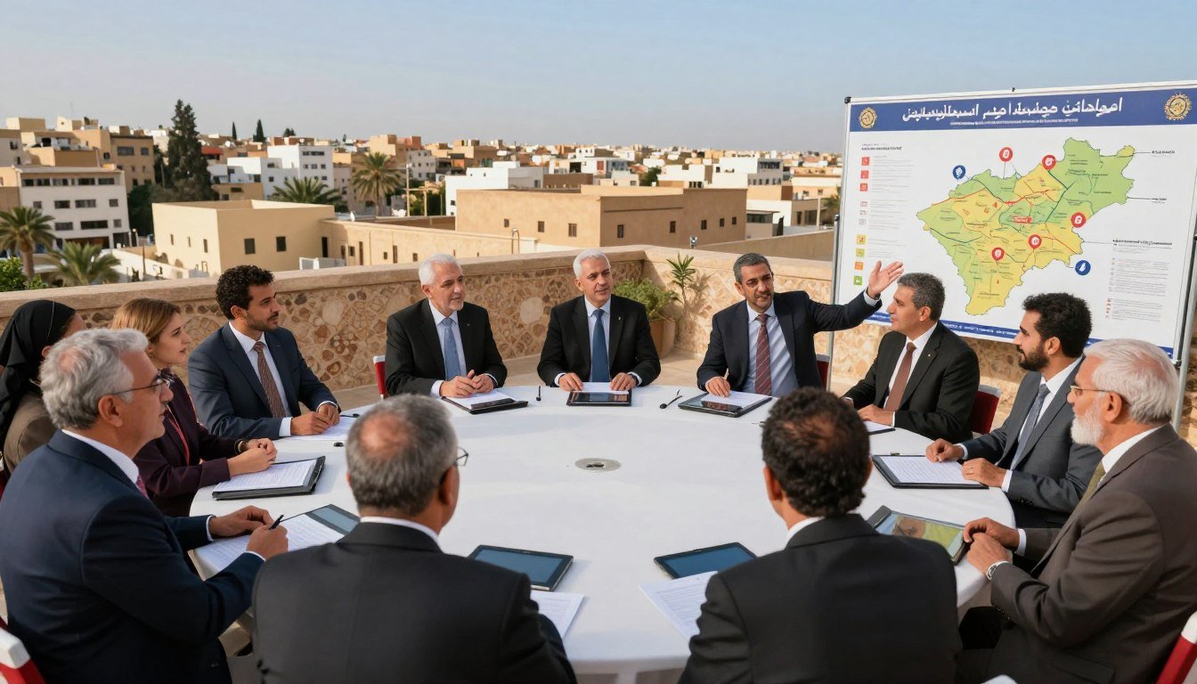 An intricate scene illustrating participatory democracy mechanisms in Morocco. In the foreground, a diverse group of professionals in business attire, engaged in a collaborative discussion around a table filled with documents and digital devices, symbolizing civic engagement. In the middle, a vibrant depiction of community members presenting ideas on a large screen, showcasing a variety of artistic and cultural elements representing Moroccan heritage. In the background, a modern cityscape of Moroccan architecture under soft, golden evening light, suggesting hope and progress. The overall mood is dynamic and optimistic, reflecting unity and collaboration in governance. The composition should be well-balanced and visually engaging, with focus on connections among the participants.