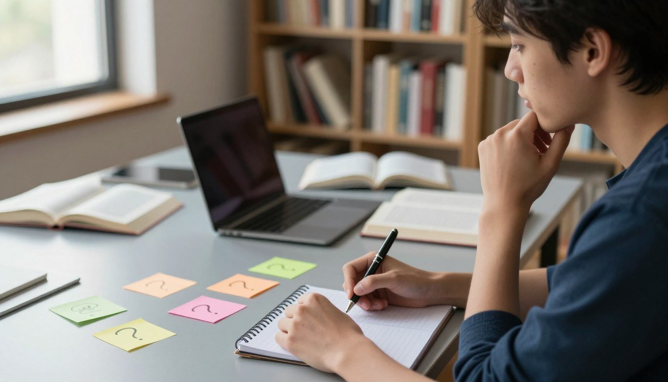 A thoughtful adult in professional attire, seated at a modern desk in a well-lit, organized office space, engaged in deep contemplation while surrounded by open books and a laptop with notes scattered around. The foreground features a cup of coffee and a notepad filled with ideas. In the middle ground, a window shows a serene cityscape, symbolizing the broader world at their fingertips. A soft, warm light filters in, creating a cozy atmosphere that invites focus, with hints of green plants adorning the background, symbolizing growth and clarity in thought. The overall mood is one of inspiration and a pursuit of knowledge, highlighting the journey of developing critical thinking skills.