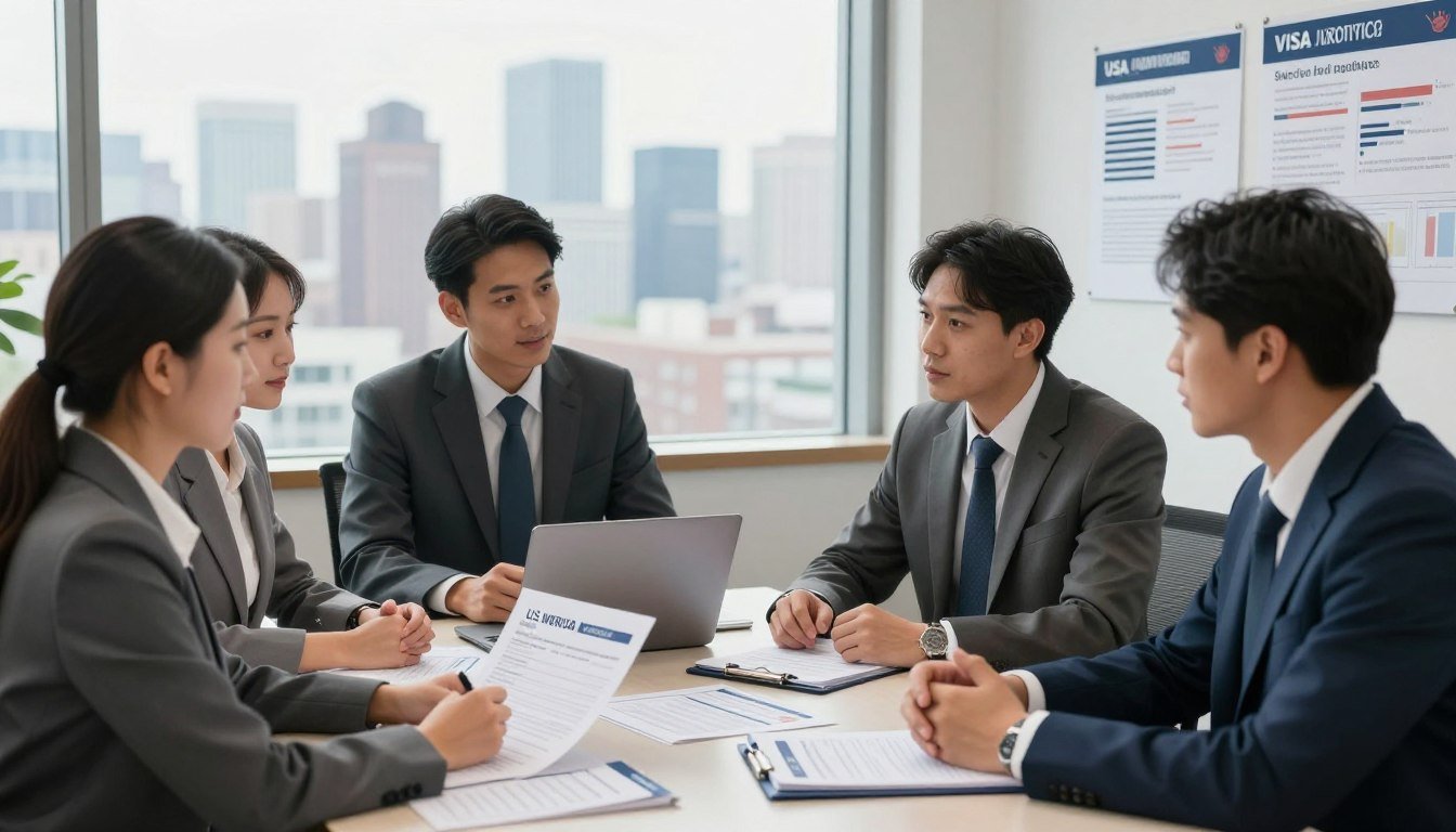 A close-up view of a professional workspace dedicated to U.S. work visas for skilled workers. In the foreground, a neatly organized desk features official visa documents, a laptop displaying the U.S. Citizenship and Immigration Services website, and a professional pen. In the middle ground, a diverse group of individuals in professional business attire engage in discussion, portraying different ethnic backgrounds and genders, symbolizing collaboration and diversity in the workplace. The background shows a large window with soft, natural light streaming in, filtered through blinds, casting gentle shadows. The atmosphere is focused and optimistic, reflecting the hope and determination of skilled workers pursuing their careers in the U.S. The overall color scheme is warm and inviting, with a slight blur to emphasize the foreground elements.